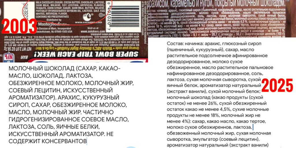 Возможно, вы сталкивались в соцсетях с публикациями в духе «сникерс уже не тот», демонстрирующими, как изменился состав шоколадного батончика сникерс? Или, может, вы недавно перечитывали состав колбасных или молочных продуктов в магазине? Всё это проявления скимфляции.