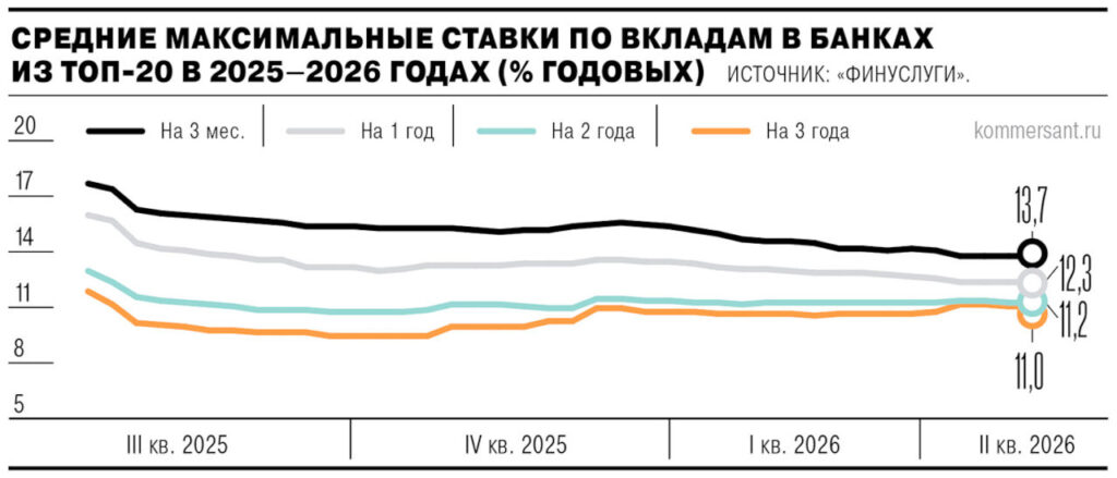 - Вклады сроком от 3 до 12 месяцев — ставки снизились до 12,3–13,7% (среднее снижение — 0,4 процентных пункта).